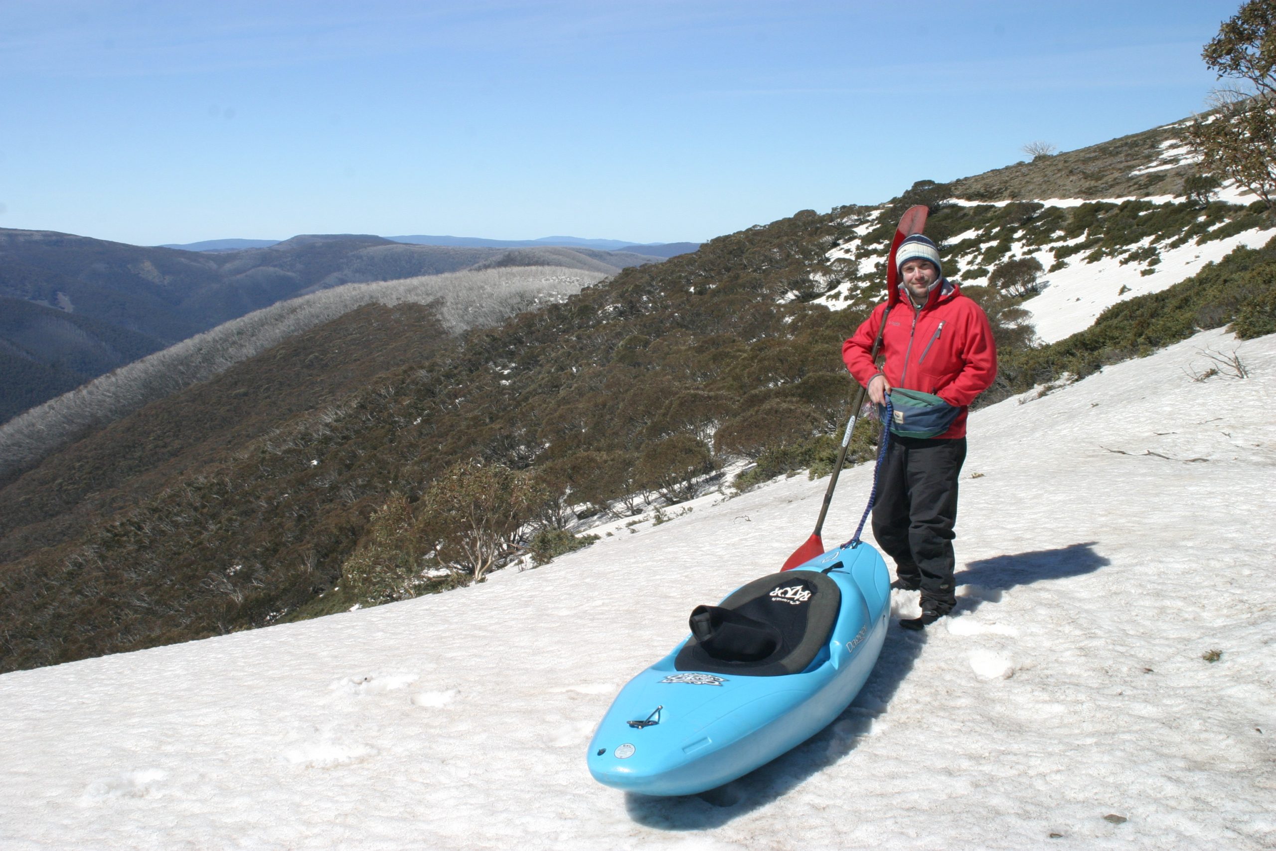 We could only imagine what the passerby’s were thinking about us two blokes. Here we were, Dave and I, above 1600 vertical meters by the side of Mt.Hotham, Victoria, hauling two white water kayaks along the snow in winter like laymen sherpa’ with no water to be seen for miles except for the frozen stuff!